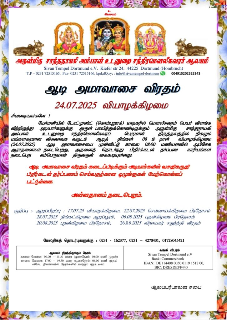 யேர்மனியில் டோட்முண்ட் (கொம்புறுாக்) மாநகரில் மெளலீசுவரம் பெயர் விளங்க வீற்றிருந்து அடியார்களுக்கு அருள் பாலித்துக்கொண்டிருக்கும் அருள்மிகு சாந்தநாயகி அம்பாள் உடனுறை சந்திரமௌலீசுவரப் பெருமான் திருத்தலத்தில் நிகழும் மங்களகரமான விசுவாவசு வருடம் ஆடித் திங்கள் 08 ம் நாள் வியாழக்கிழமை (24.07.2025) ஆடி அமாவாசையை முன்னிட்டு காலை 08:00 மணியளவில் அபிசேக ஆராதனைகள் நடைபெற்று, அதனைத் தொடர்நது பிதிர்க்கடன் தர்ப்பண காரியங்கள் நடைபெற எம்பெருமான் திருவருள் கைகூடியுள்ளது.
